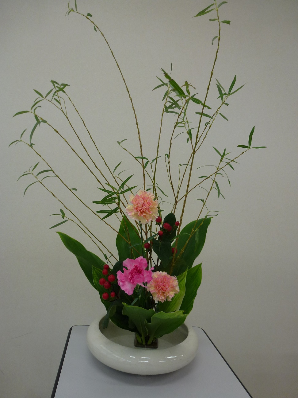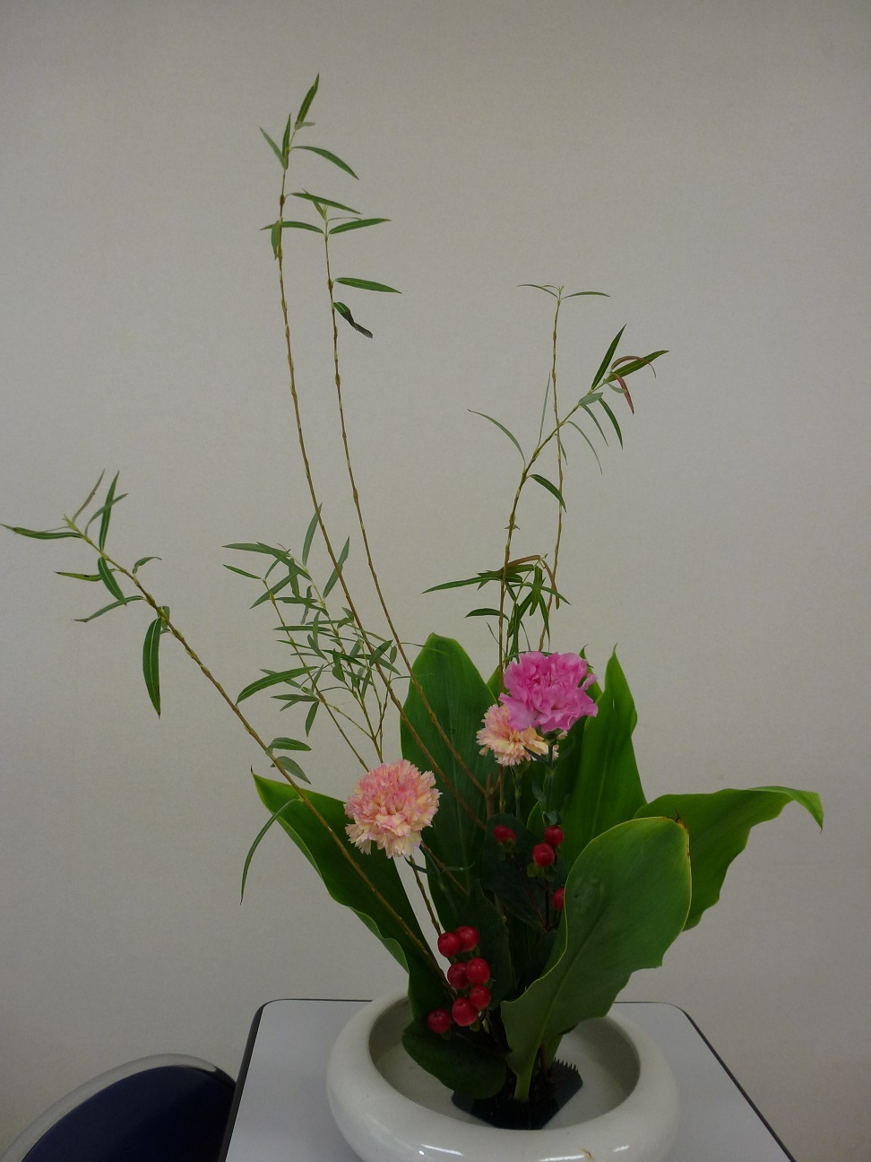 花材 行李柳(こりやなぎ)、カーネーション、ヒペリカム、青ドラ