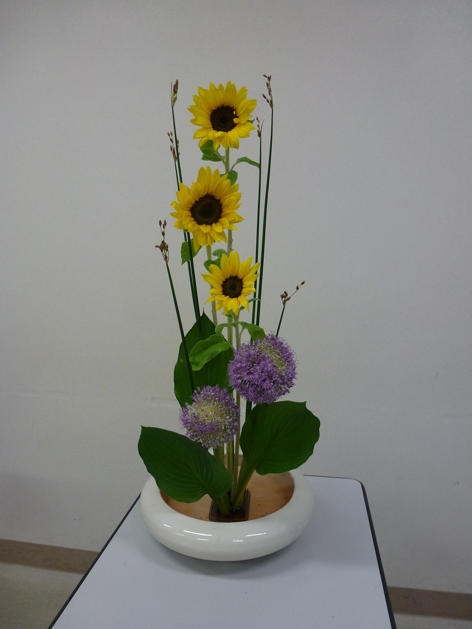 黄色いひまわりと、ネギ坊主のような、薄紫の「ギガンジューム」が主役です。