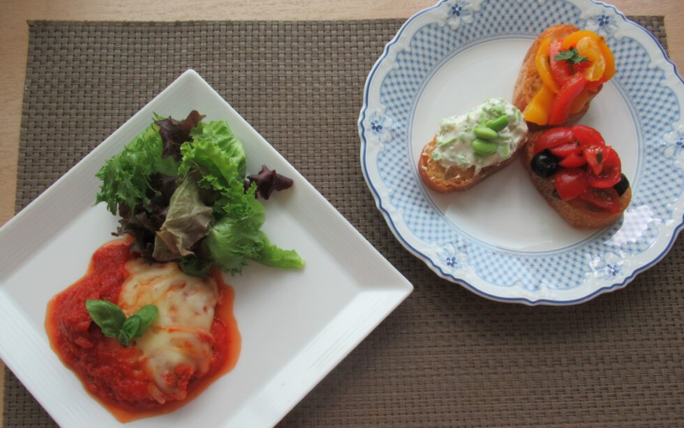 ミニトマトとバジルのブルスケッタは、初めてのオリーブの実を味わおうと意気込んでいたのにうまくいかなくて勿体無かったです。