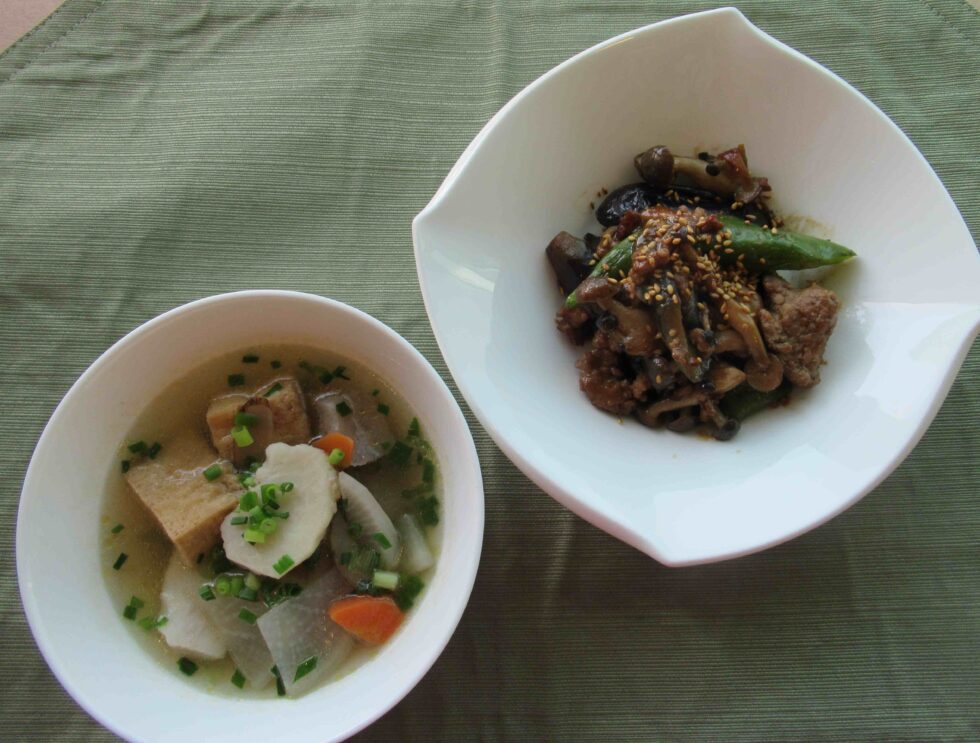 今月のテーマは、新米と楽しむ和食ということで、肉味噌炒めもけんちん汁も新米(雪若丸)に良く合うほっこりとする家庭料理でした。